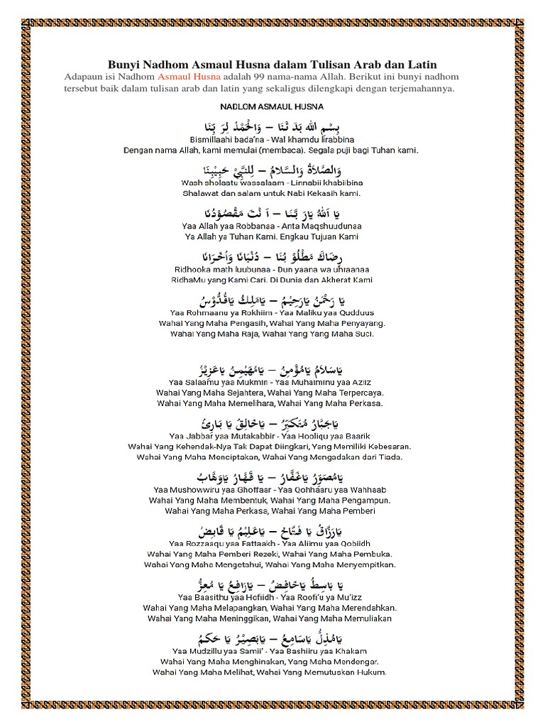 Bacaan Asmaul Teks Asmaul Husna Latin / 99 Asmaul Husna Lengkap Arab Latin Terjemahan Jurnal Garut. Hadits ini sahih riwayat bukharidan muslim yang berasal dari sahabat abu hurairah radiallahu anhu, bahwa. Karena itulah, blog ayo madrasah, kali ini membagikan teks nadlom asmaul husna dalam bentuk file pdf dan doc (microsoft word). Daftar teks tulisan asmaul husna arab latin dan artinya. Bacaan asmaul husna sendiri berjumlah 99 dan kesemuanya memiliki makna dan arti yang indah serta sebagai bukti akan kebesaran allah swt. 99 asmaul husna artinya, serta maknanya dan apa pentingnya memahami asmaul husna.